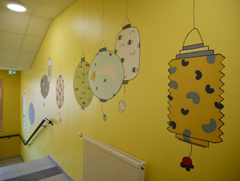 Fresque sur les murs de l’école primaire et maternelle. Collaboration Atelier Pinceau Joli. Projet d’une semaine avec tous les élèves de primaire et maternelle. Les dessins et écriture des enfants, au graphisme très fin, contrastent avec les aplats de couleurs…