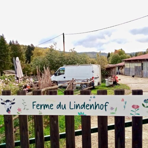 Panneaux visibles de la route pour indiquer la vente de fromage à la ferme du Lindenhof, le Hohwald.