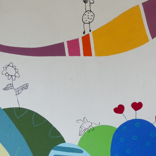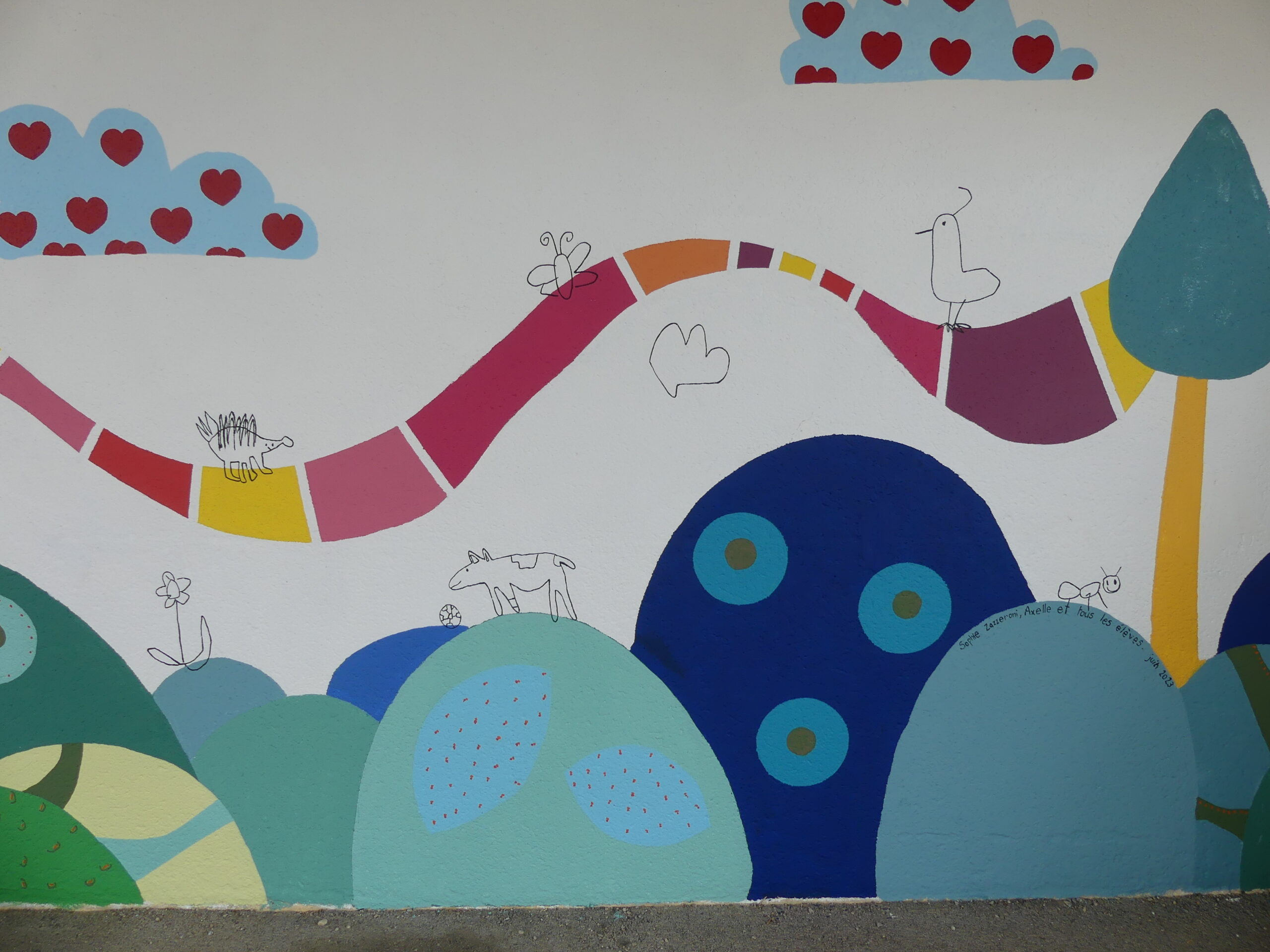 La fresque a été réalisée en 5 jours par tous les élèves de maternelle et primaire de l’école. Les deux préaux sont maintenant colorés et avec plein de détails à découvrir….