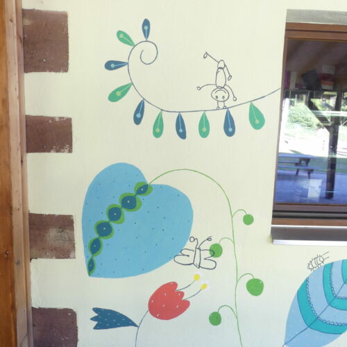 Les enfants ont dessiné des oiseaux, insectes , feuilles et fleurs, qui ont été peint ensuite sur le décor.